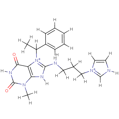 InChI=1/C20H23N7O2/c1-14(15-7-4-3-5-8-15)27-16-17(25(2)20(29)24-18(16)28)23-19(27)22-9-6-11-26-12-10-21-13-26/h3-5,7-8,10,12-14H,6,9,11H2,1-2H3,(H2,22,23,24,28,29)/p+2/t14-/m1/s1
